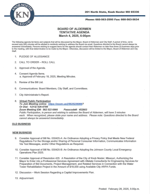 Board of Aldermen Tentative Agenda March 4, 2025 (IMAGE)