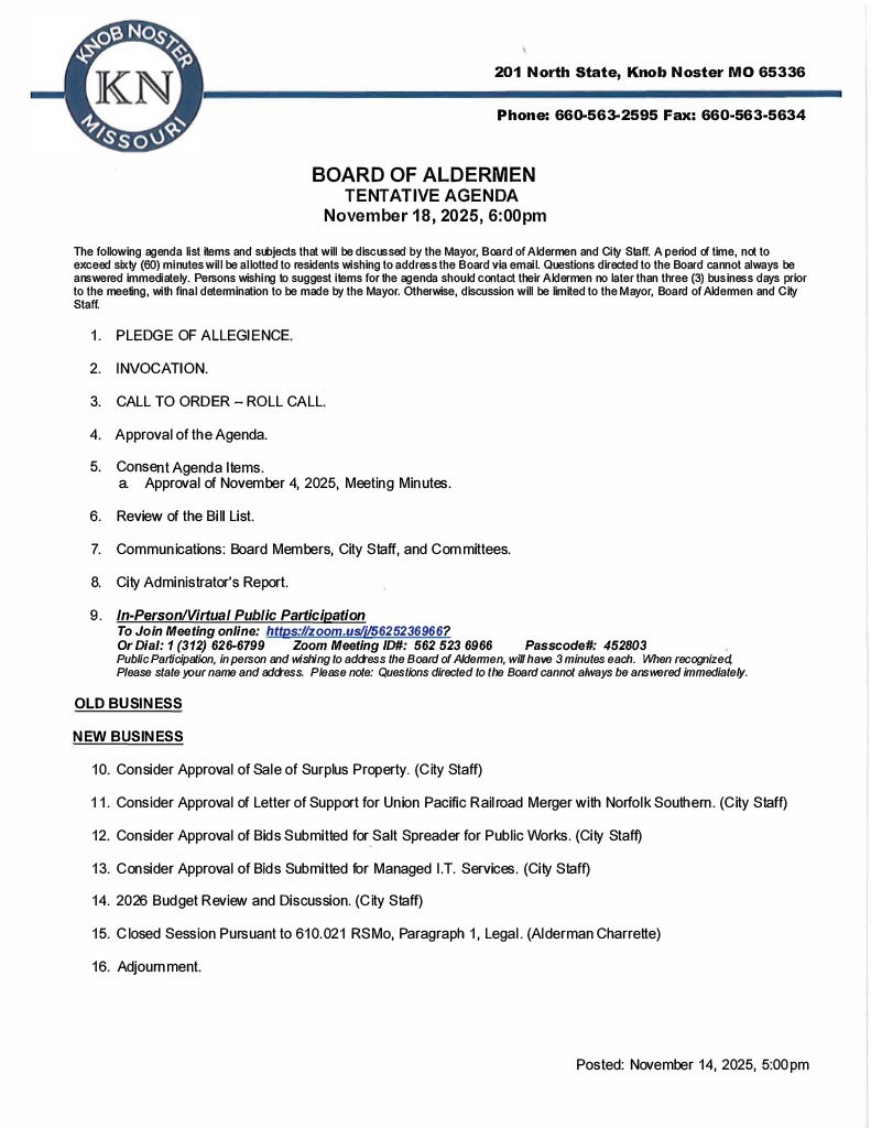 Board of Aldermen Tentative Agenda November 18, 2025 6:00 PM
