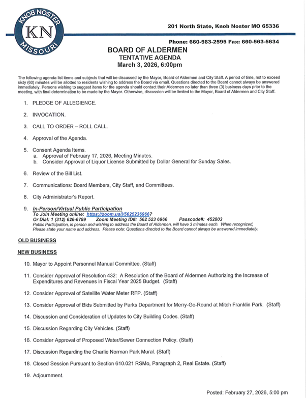 NOTICE: Board of Aldermen Meeting - Tuesday, March 3, 2026 6:00 PM