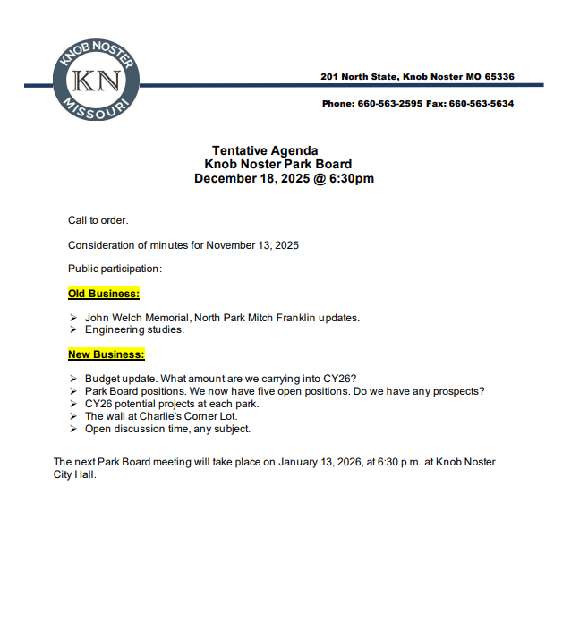 Park and Rec Tentative Agenda December 18, 2025 6:30 PM