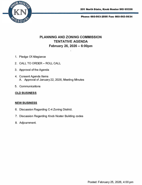 PUBLIC NOTICE: Planning and Zoning Commission Meeting — The City of Knob Noster Planning and Zoning Commission will hold a meeting this Thursday, February 26, 2026, at 6:00 PM at City Hall.February 25, 2026