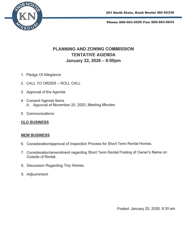 PUBLIC NOTICE: Planning and Zoning Commission Meeting The Knob Noster Planning and Zoning Commission will hold a meeting this Thursday, January 22, 2026, at 6:00 PMJanuary 20, 2026