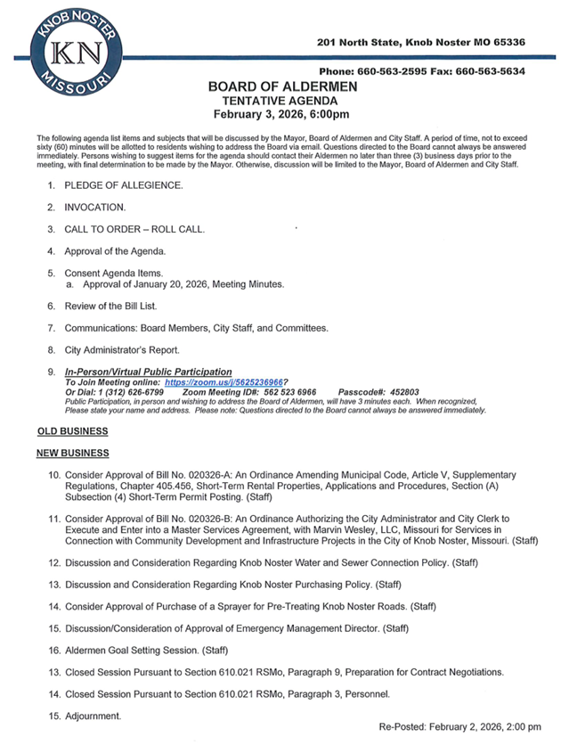 Public Notice: Updated Board of Aldermen Tentative Agenda February 3, 2026 6:00 PMFebruary 02, 2026