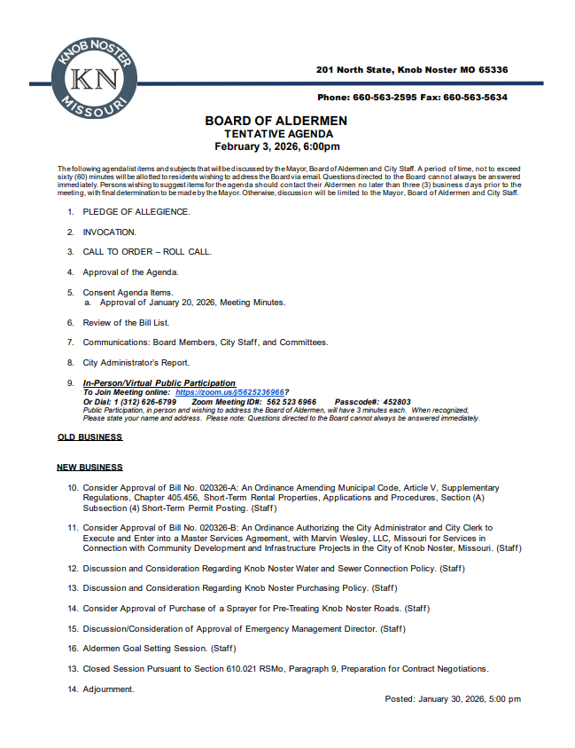The Board of Aldermen will hold its regular meeting on this Tuesday February 3, 2026, at 6:00 PM.January 30, 2026